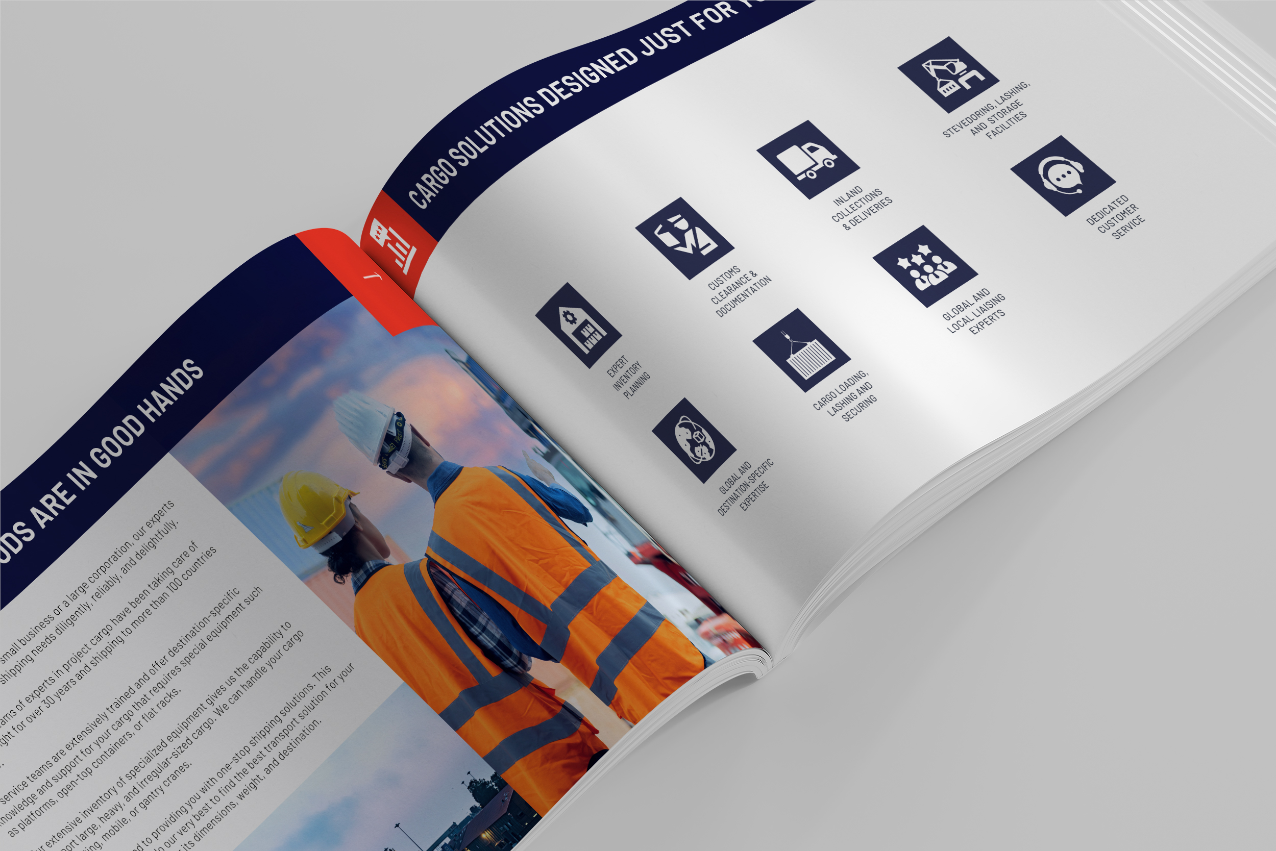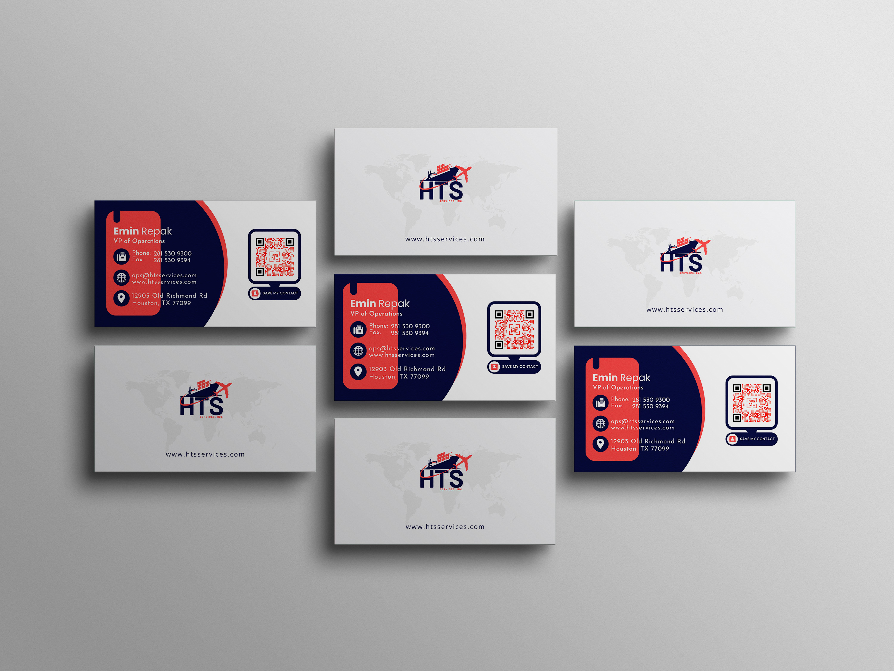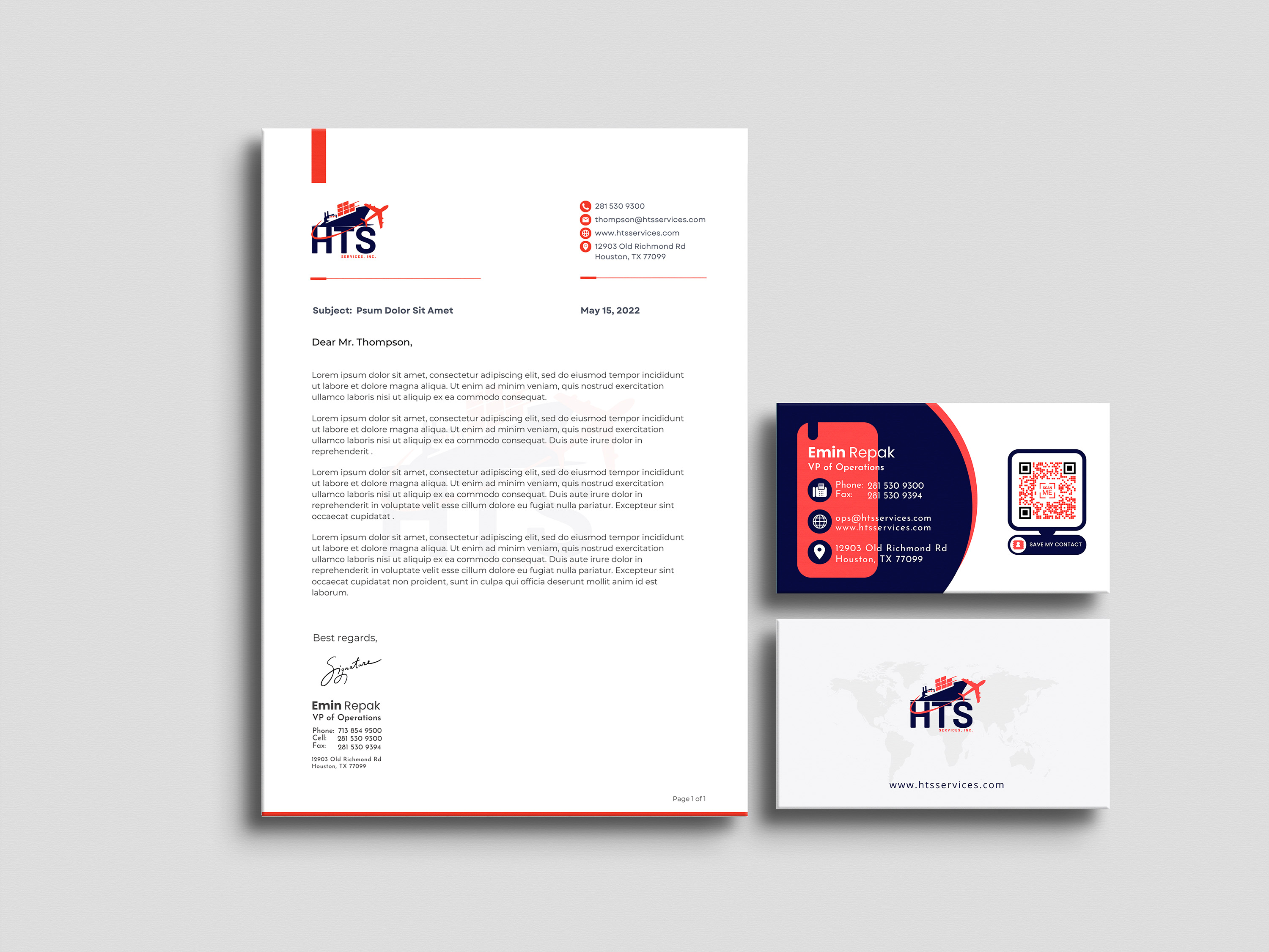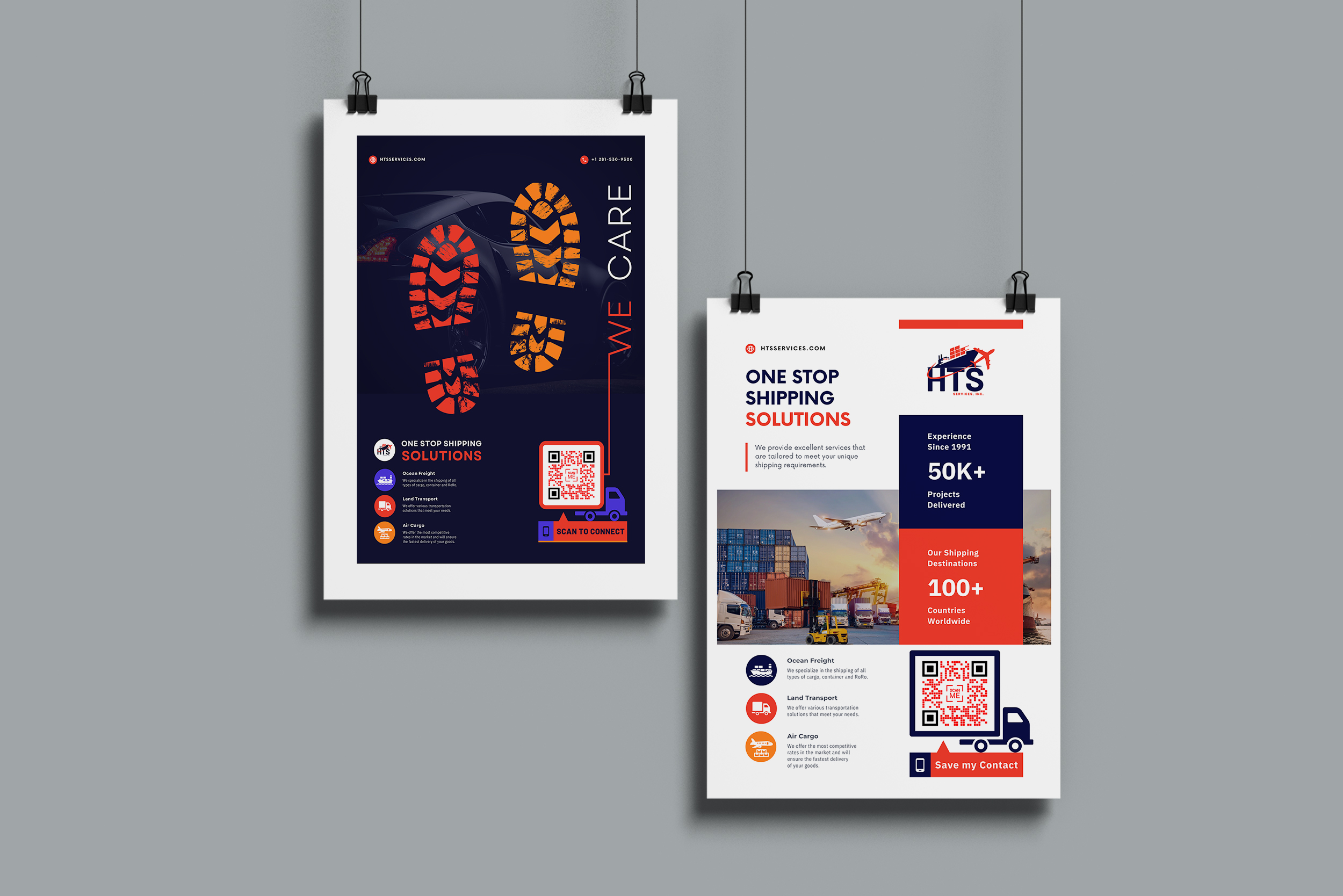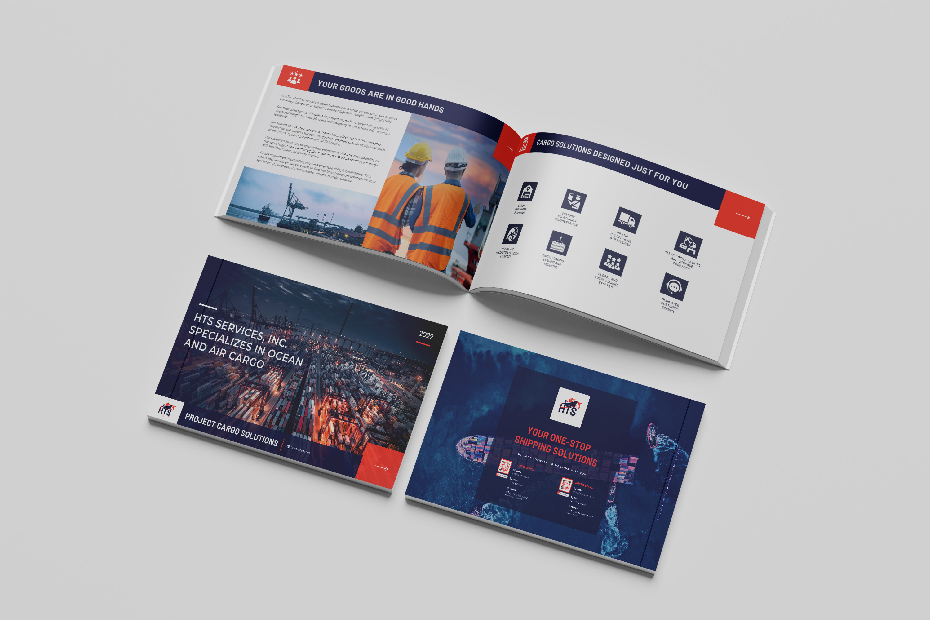 A set of marketing materials created for HTS Services, a shipping solutions company.